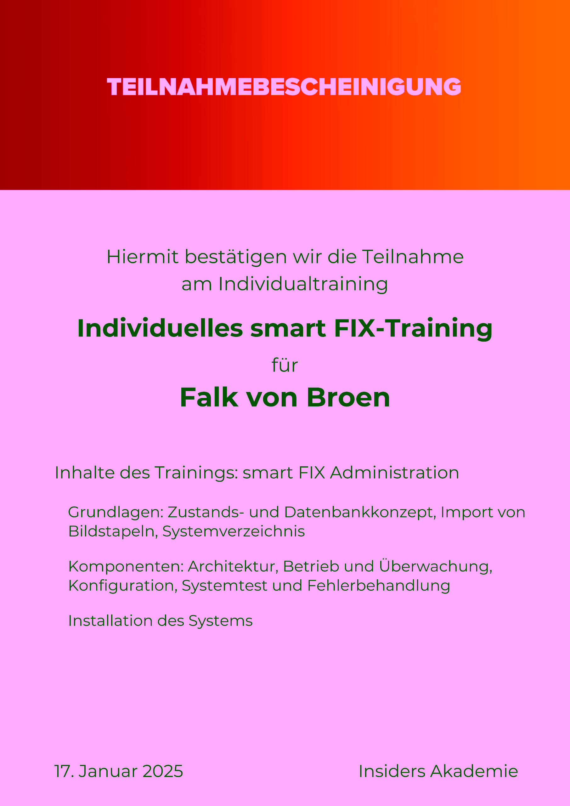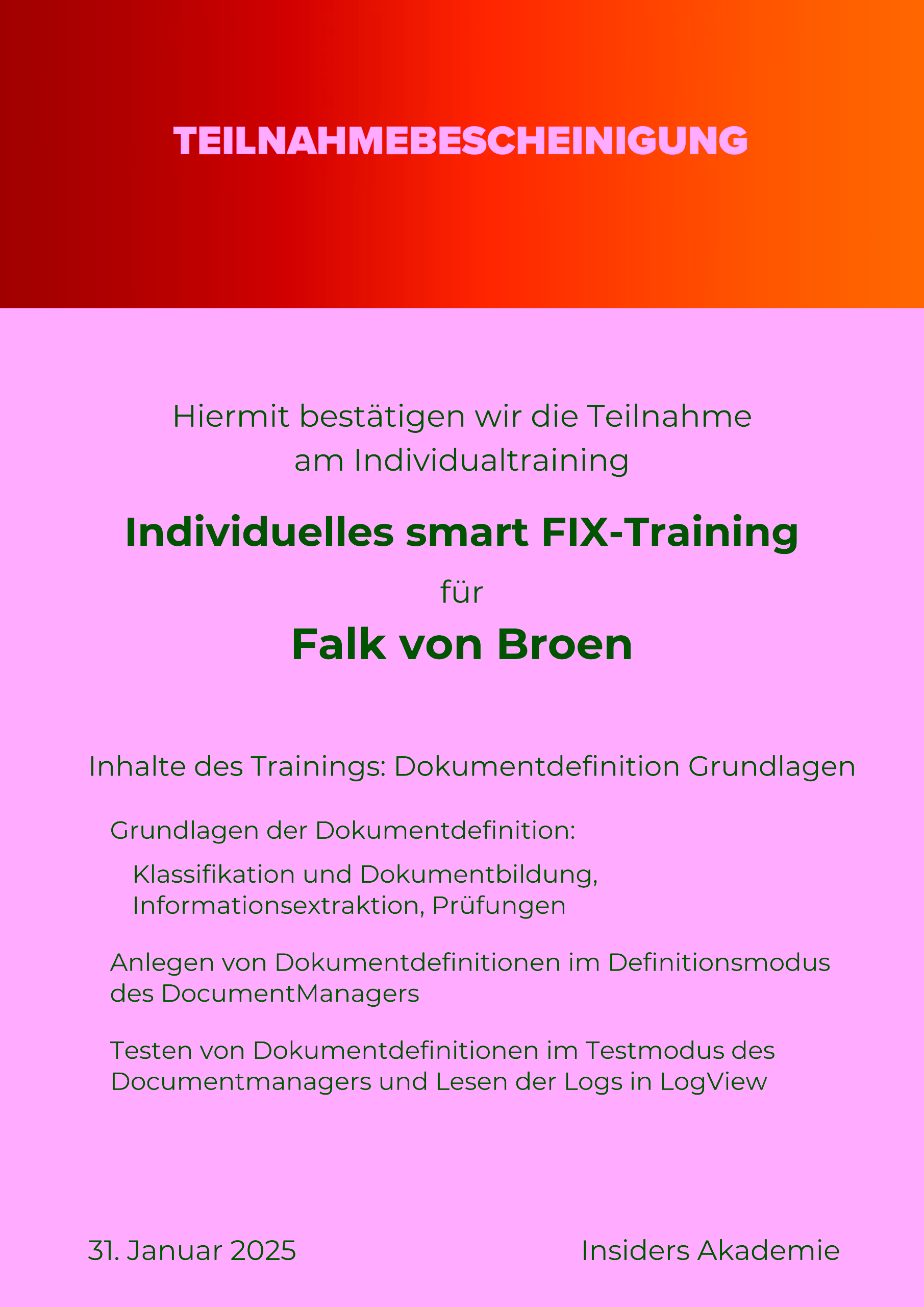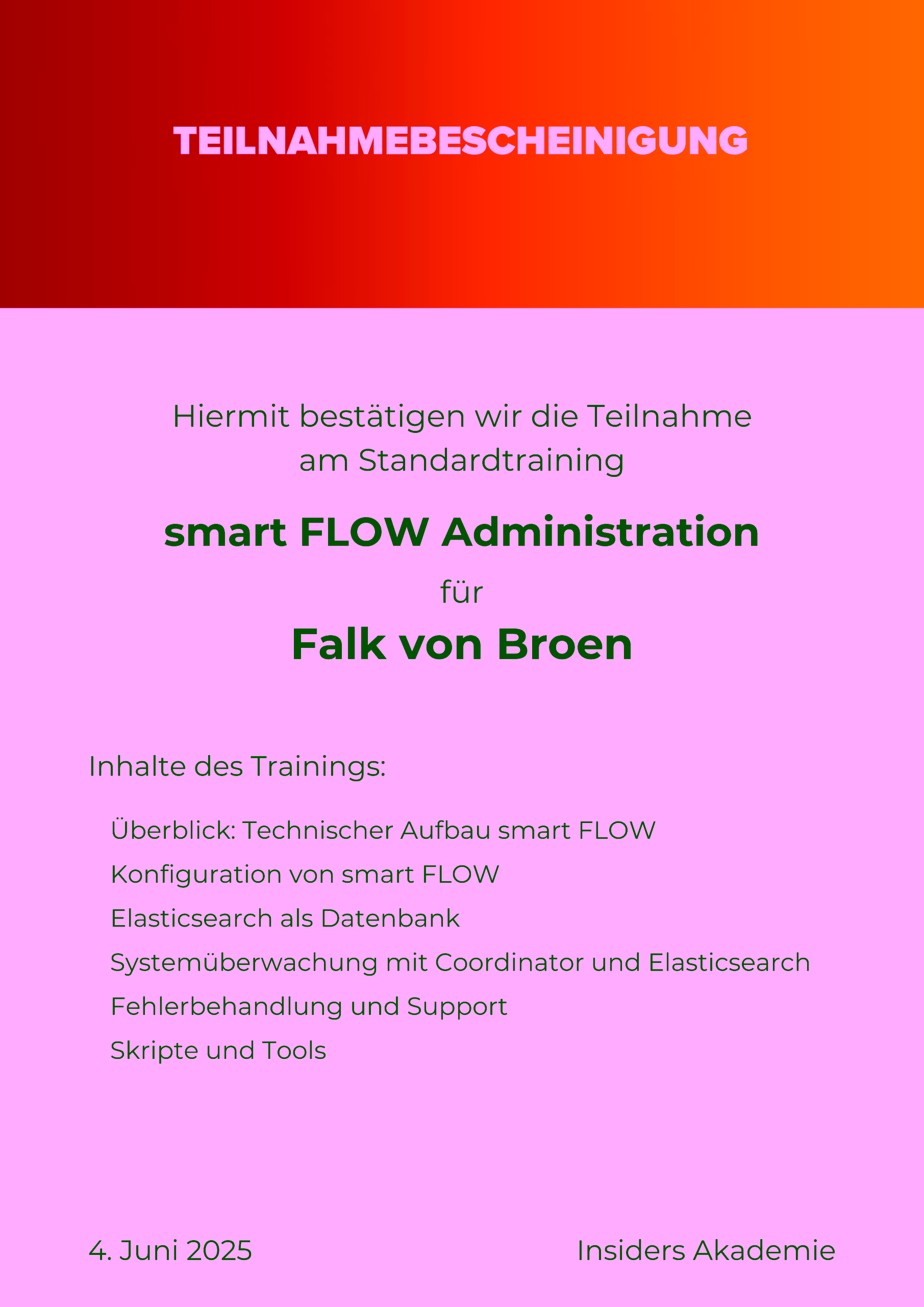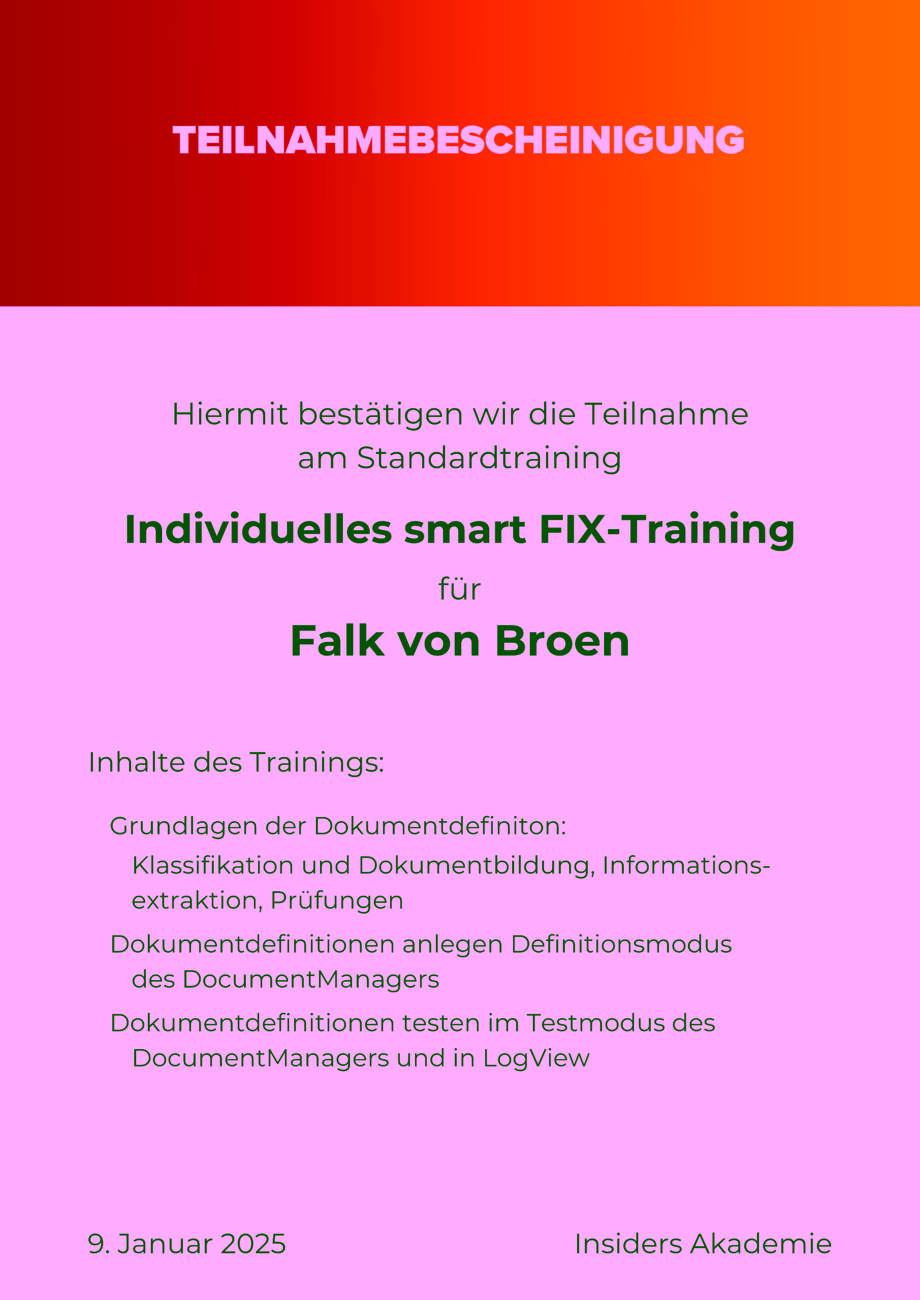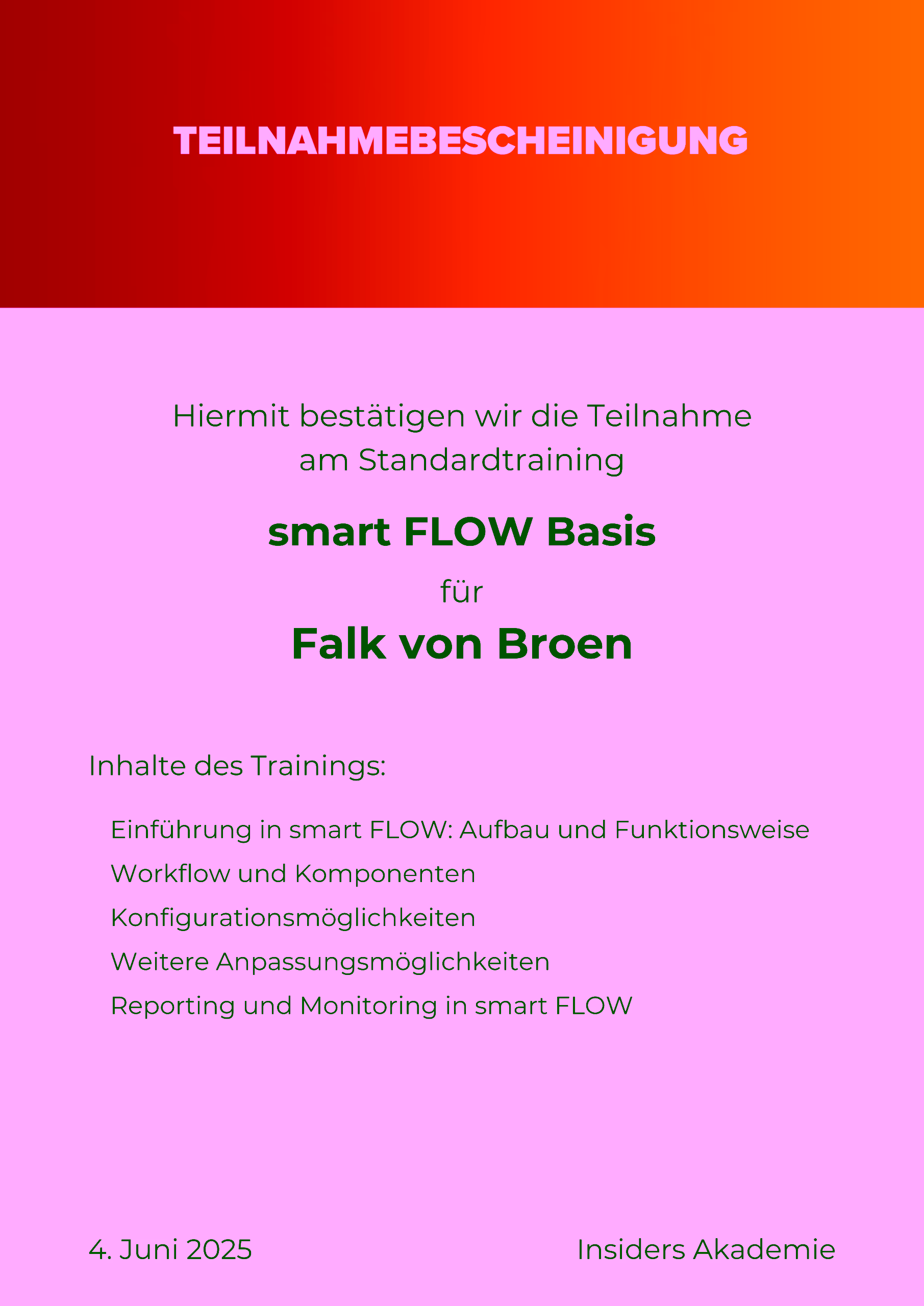 - Insiders smartFlow: Qualifizierung in der Prozessautomatisierungs-Software zur Steuerung der digitalen Posteingangs-Workflows.