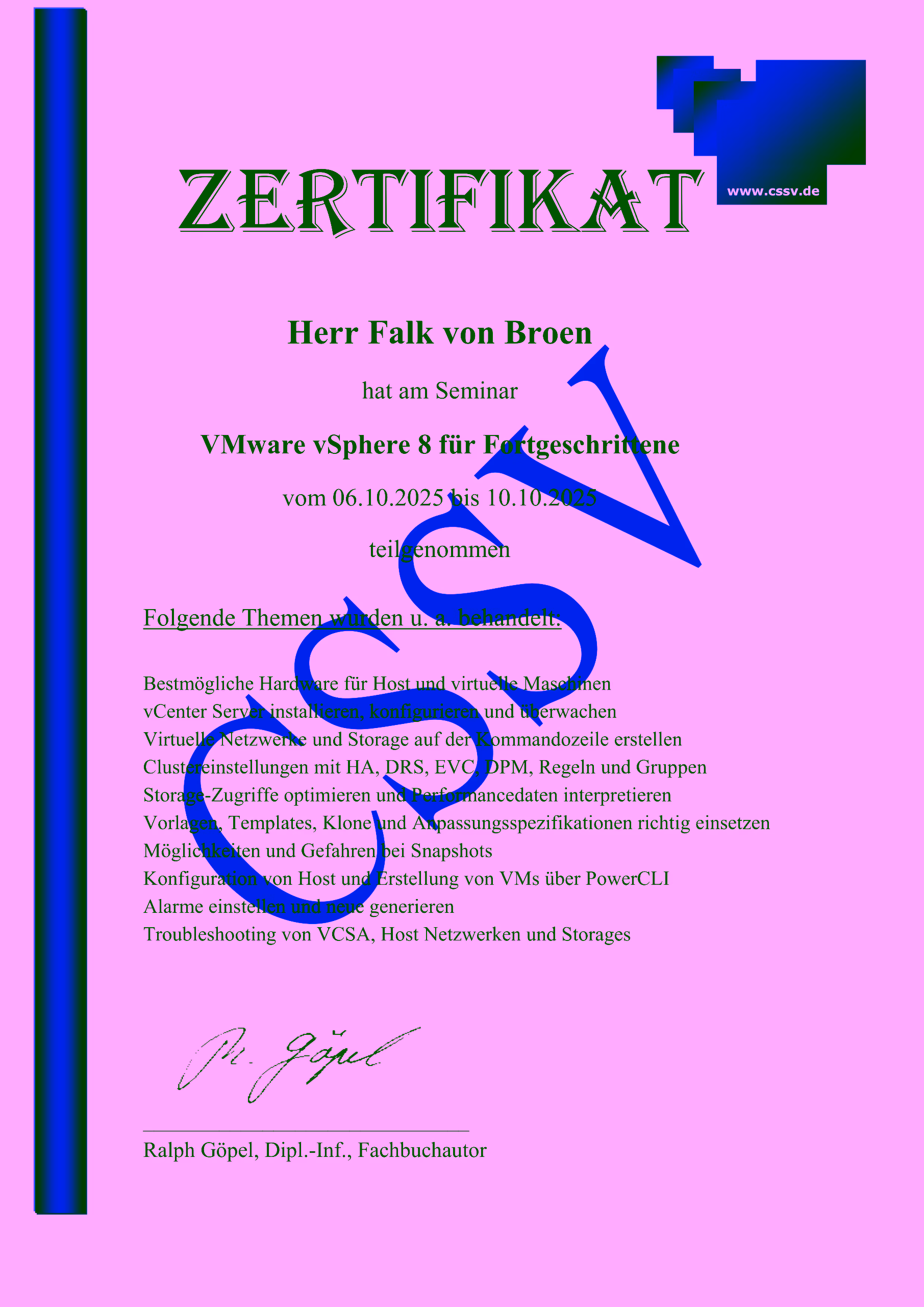 Anfang des Jahres 2015 begann Herr von Broen mit der Dozententätigkeit in der Volkshochschule Deggendorf. Später kamen dann noch die Volkshochschulen Straubing, Freyung-Grafenau und Passau hinzu. Mittlerweile umfasst sein Portfolio sowohl Bildbearbeitungskurse zu Adobe Photoshop und GIMP, als auch Kurse zu Adobe InDesign und Microsoft Office. Für Senioren und PC-Neueinsteiger gab Herr von Broen ebenfalls Einsteiger-Kurse.